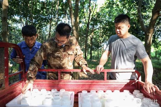 在海南儋州的橡胶林里,中国热带农业科学院橡胶所的科研人员在收集胶乳。