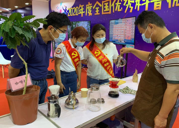 广州站参展了在广州越秀国际会议中心101展厅举行的广州创新科普嘉年华线下活动。科普展上,广州站以咖啡为特色主题,通过咖啡树盆栽展示、咖啡文化墙布展和宣传材料发放、咖啡冲泡品鉴、兴科系列咖啡产品展示等多种科普手段结合,向民众普及了咖啡起源、咖啡品种、咖啡加工工艺等相关文化和科技知识。广州站同时对我院香草兰、可可等其他热带农业科技产品进行了宣传推介。