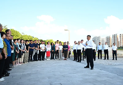 2022年8月16日至17日,中共中央总书记、国家主席、中央军委主席习近平在辽宁考察。这是16日下午,习近平在锦州市东湖森林公园察看小凌河沿岸生态环境时,同正在休闲、进行文化活动的群众亲切交流。新华社记者 燕雁 摄
