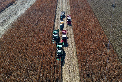 铁岭市铁岭县联合收割机正在机械化收割玉米