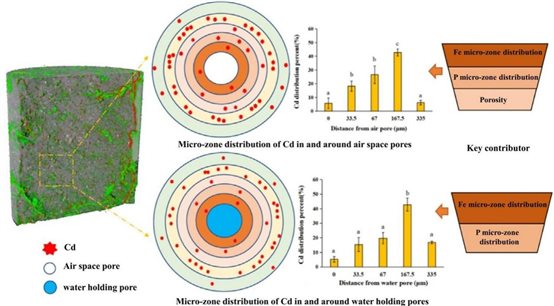 热带作物受镉(Cd)等重金属的污染已成为制约热区农产品质量安全与农业可持续发展的重要问题。土壤异质性导致重金属环境行为过程复杂,一直是重金属污染治理的难点。传统基于总量和平均量的研究方法难以反映由空间、物理、化学和生物共同作用产生的土壤异质性对重金属环境行为的影响。为突破该问题,研究团队建立了X射线显微计算机断层扫描结合扫描电镜-能量色散能谱土壤重金属微区可视化研究方法,结合全景组织细胞定量分析系统,实现了对土壤孔隙内及周围Cd微区分布的原位定量研究。基于团队前期研究发现的团聚体铁、磷形态影响热带农田土壤Cd固持的重要作用,通过该方法分析得到了原状土壤孔隙及周围Fe、P、Cd的微区分布特性,进一步揭示了热带农田土壤的孔隙特性(包括孔隙大小和持水能力)通过控制Fe、P元素微区赋存,影响土壤Cd微区分布特征的微观机制。