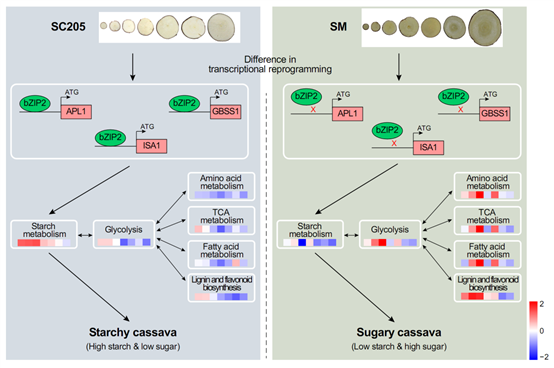 研究团队以淀粉木薯(SC205)和糖木薯(SM)为材料,鉴定了许多碳水化合物相关代谢物在SC205和SM之间差异积累,其中果糖-6-磷酸和葡萄糖-6-磷酸与蔗糖/淀粉代谢基因的表达显著负相关;揭示了块根发育过程中蔗糖/淀粉代谢、糖酵解和TCA循环、脂质代谢以及木质素和类黄酮生物合成在代谢组和转录组水平的协调变化,但它们在SC205和SM之间具有不同的丰度模式;bZIP2可以直接与APL1、ISA1和GBSS1的启动子结合,并促进它们在SC205中的表达水平,但这些相互作用在SM中不存在;APL1、ISA1或GBSS1瞬时沉默导致淀粉含量显著降低,bZIP2瞬时沉默抑制了APL1、ISA1和GBSS1的表达,进而降低了淀粉含量。研究结果揭示了碳水化合物相关途径/基因的协调调控对木薯淀粉积累具有重要贡献,为薯类作物淀粉遗传改良提供了重要理论支撑。