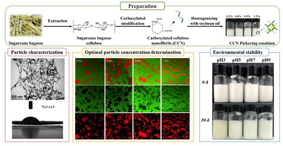 相关研究成果以 “Carboxylated cellulose nanofibrils from sugarcane bagasse as stabilizers for Pickering emulsions” 为题发表于《LWT - Food Science and Technology》。中国热科院加工所科研人员胡宏和华中农业大学联培硕士研究生沈小倩为论文共同第一作者,中国热科院加工所周伟研究员和黄晓兵副研究员为论文共同通讯作者。该研究得到了国家自然科学基金、广东省基础与应用基础研究基金、海南省重点研发等项目的资助。