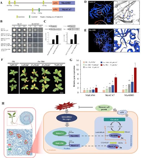 图2. 中柱鞘细胞中Zn 2 +依赖MaKAN4-MaACA7/MaADH3模块应答Foc TR4感染的分子机制