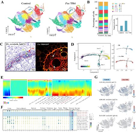 图1. Foc TR4感染后香蕉根尖中柱鞘细胞的拟时轨迹分析