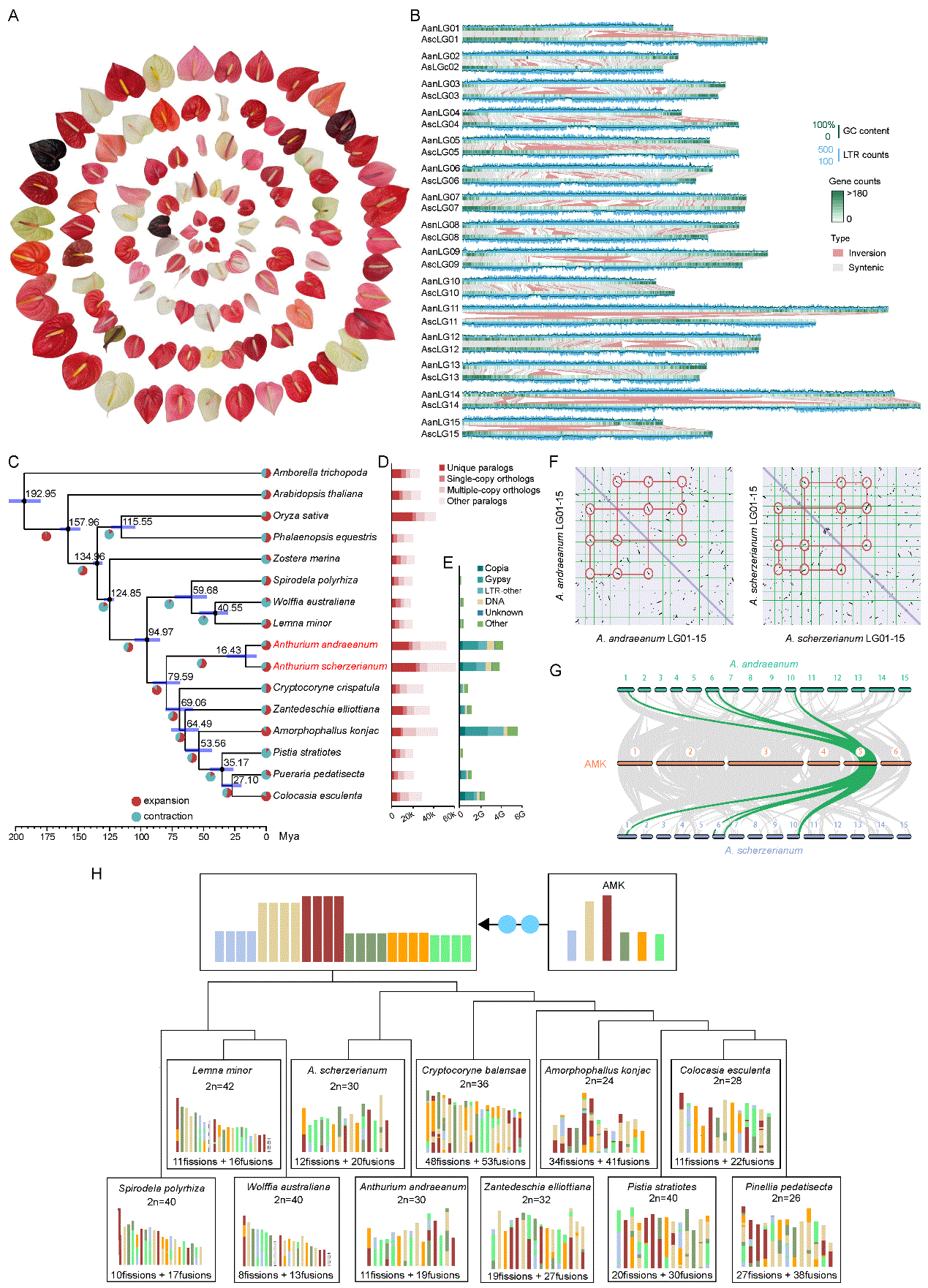 研究团队基于二代、HiFi、HiC测序对 A. andraeanum(Aan)和 A. scherzerianum(Asc)进行de novo组装,获得高质量染色体级基因组。Aan 基因组总大小4.15 Gb;Asc 总大小3.84 Gb。比较基因组学分析显示,红掌经历两次全基因组加倍(WGD),并伴随大量转座子(尤其是LTR元件)的爆发式扩张,推动了基因组快速膨胀与结构重排,为其复杂、多样的观赏性状提供了遗传基础。