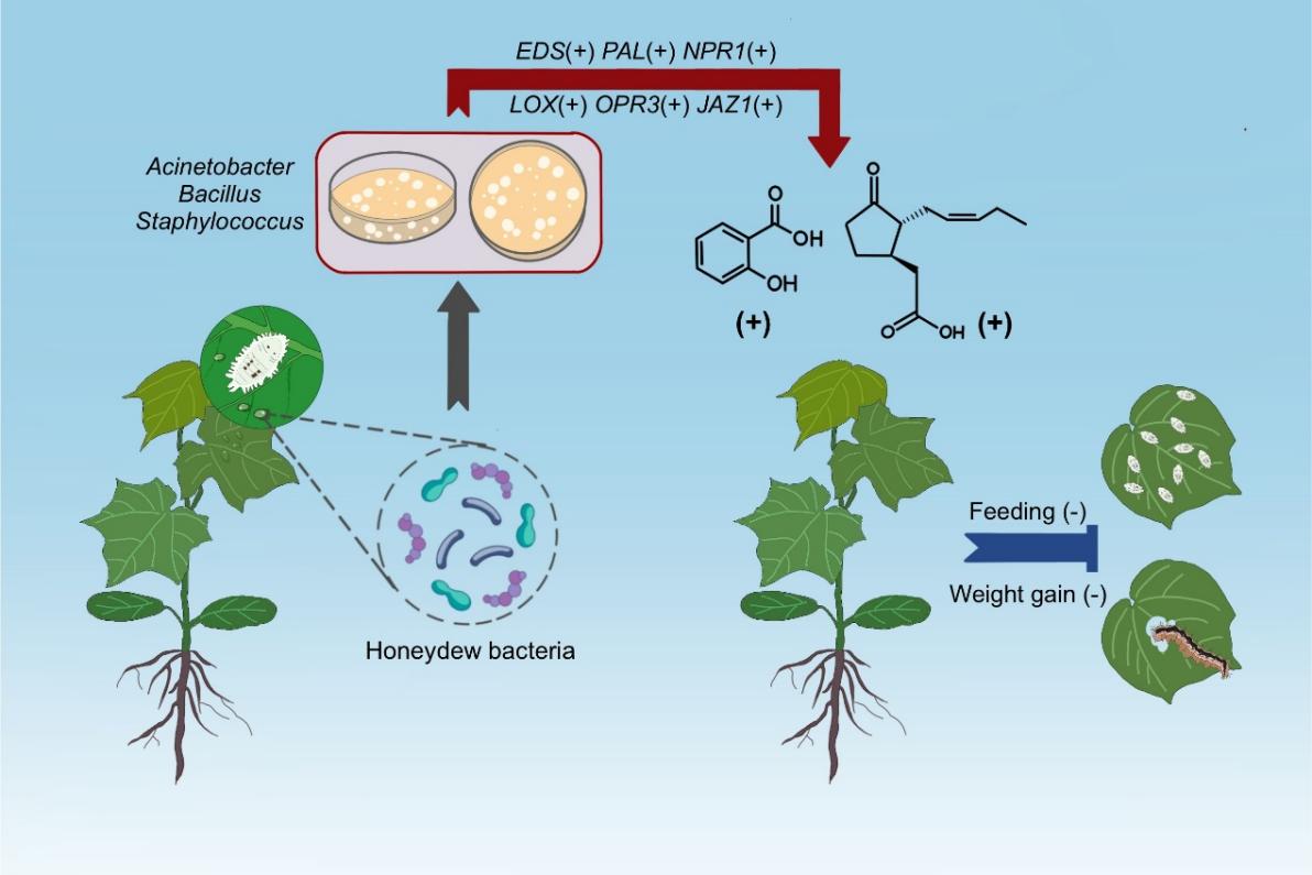 半翅目昆虫分泌的蜜露是诱发植物煤烟病的有害物。然而,团队近期发现扶桑绵粉蚧蜜露沉积在植物表面后,可诱导植物防御信号增强,有效抑制后续侵染的粉蚧和其他植食性害虫的生长。进一步解析发现,蜜露中不动杆菌(Acinetobacter)、芽孢杆菌(Bacillus)和葡萄球菌(Staphylococcus)可促进植物中水杨酸和茉莉酸的积累并激活其相关基因的表达,从而提升植物抗虫能力,实现从“致害因子”到“防御激活剂”的功能转变。
