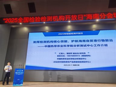 9月11日,在“2025全国检验检测机构开放日”海南分会场活动中,测试中心副主任黎舒怀以《发挥检测机构核心效能,护航海南自贸港行稳致远》为题进行交流,他表示作为长期扎根热区的国家级检测机构,测试中心围绕食品农产品质量安全积极为政府监管和社会服务提供检验检测服务,检测领域覆盖食品农产品、农业投入品、产地环境等从农田至餐桌的全链条环节,为政府决策提供了科学依据,每年还为超400家企业及500多个产品提供绿色食品、有机食品等认证服务,有效提升了海南农产品的附加值和市场信誉,为海南人民“舌尖上的幸福”保驾护航。