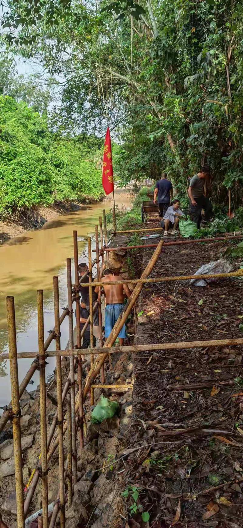 由于塌方处车辆无法驶入,购买60条建筑铁管需完全依靠人工进行搬运,但大家毫无怨言、分工明确,有序投入铁管焊接、落石清理等工作。经过大家的齐心协力,仅一天时间内就搭建起了一条长15米、宽5米的护堤,装填沙土200多袋用于护堤进行加固。